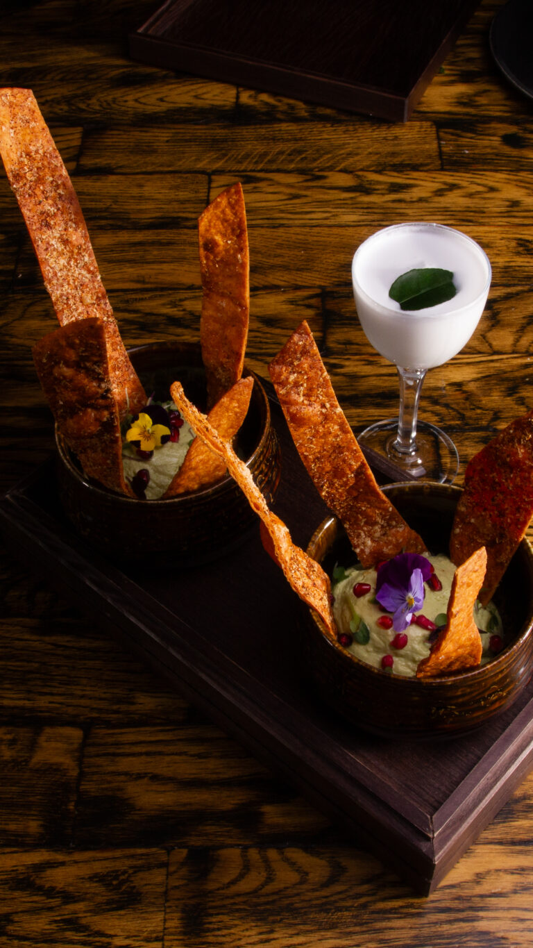 Stökkt Parmesan tortilla kex, avocado og mascarponemús, granatepli