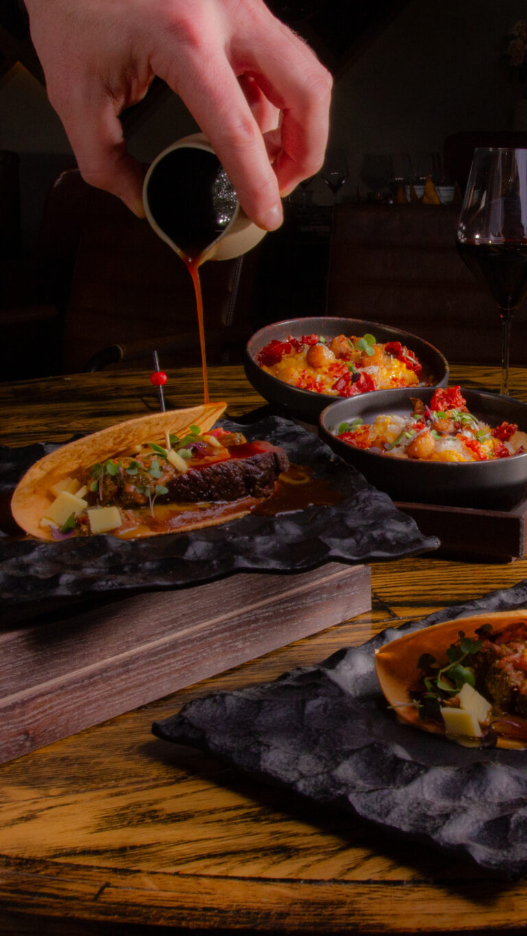 Noisette grilluð nautalund, mjúk tortilla, mole, eldpipar-og sítrussalsa, kakó-og reyktur eldpipargljái